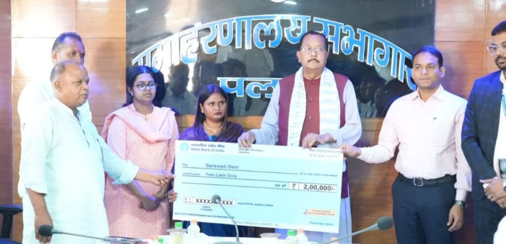 बैठक के उपरांत प्रधानमंत्री जीवन ज्योति बीमा योजना के लाभुकों के बीच चेक का वितरण भी किया गया* ।बैठक में उप विकास आयुक्त जावेद हुसैन,पलामू व चतरा सांसद प्रतिनिधि,हुसैनाबाद विधायक प्रतिनिधि,एलडीएम अशोक कुमार श्रीवास्तव,डीडीएम नाबार्ड शालीन लकड़ा, आरबीआई के प्रतिनिधि तथा विभिन्न बैंकों के प्रतिनिधि उपस्थित रहे।