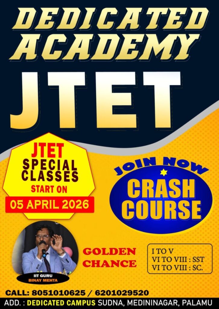 Palamu : शिक्षा के क्षेत्र में बेहतर भविष्य बनाने का सपना देखने वाले छात्रों के लिए डेडीकेटेड एकेडमी एक शानदार अवसर लेकर आया है। आगामी 5 अप्रैल से यहाँ JHTET (Jharkhand Teacher Eligibility Test) क्रैश कोर्स बैच की शुरुआत की जा रही है, जो छात्रों को कम समय में प्रभावी तैयारी कराने के उद्देश्य से तैयार किया गया है।