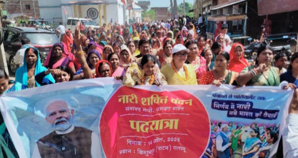 Palamu : पाटन प्रखंड अंतर्गत किशुनपुर गाँव में महिलाओं के द्वारा भाजपा के वरिष्ठ नेत्री सुश्री स्मिता आनंद एवं मेदिनीनगर के महापौर श्रीमती अरुणा शंकर के नेतृत्व में नारी शक्ति वंदन अधिनियम बिल के समर्थन में पदयात्रा निकाली गई। यह पद यात्रा किशुनपुर अम्बेडकर चौक से प्रारम्भ होकर विभिन्न चौक चौराहों से होते हुए चनेया बाजार तक गई। भारी संख्या में उपस्थित महिलाओं के नारी शक्ति जिन्दावाद के नारों से पुरे क्षेत्र को गूंजयमान हुआ।