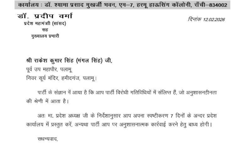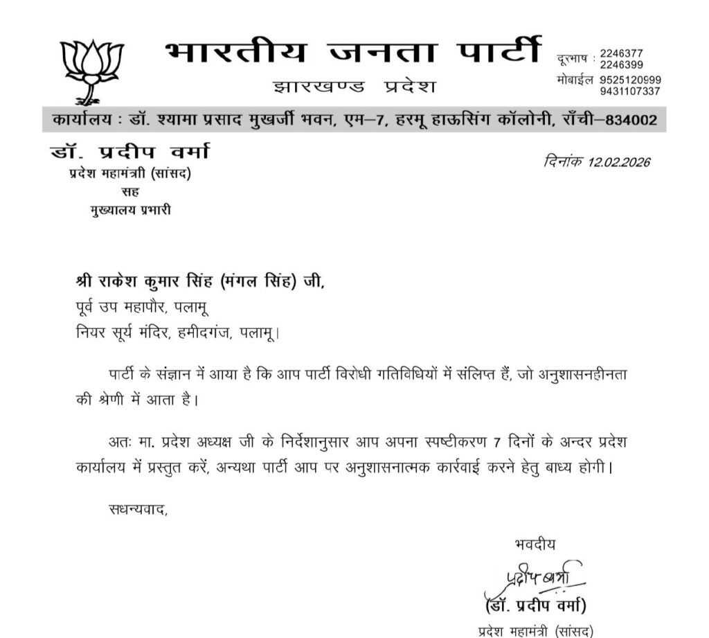 Palamu : भारतीय जनता पार्टी के प्रदेश महामंत्री प्रदीप सिन्हा ने मेदिनीनगर नगर निगम के पूर्व उप महापौर राकेश कुमार सिंह उर्फ मंगल सिंह को पत्र जारी कर कहा है कि पार्टी के संज्ञान में आया है कि आप पार्टी विरोधी गतिविधियों में शामिल हैं। जो अनुशासनहीनता की श्रेणी में आता है। प्रदेश अध्यक्ष के निर्देशानुसार आप अपना स्पष्टीकरण 7 दिनों के अंदर प्रदेश कार्यालय में प्रस्तुत करें। अन्यथा पार्टी आप पर अनुशासनात्मक कार्रवाई करने हेतु बाध्य होगी। प्रदेश महासचिव प्रदीप सिन्हा ने इस आशय की जानकारी भाजपा के प्रदेश अध्यक्ष आदित्य साहू, राष्ट्रीय महामंत्री अरुण सिंह, नेता प्रतिपक्ष बाबूलाल मरांडी, प्रदेश महामंत्री संगठन कर्मवीर सिंह और पलामू जिला भाजपा के अध्यक्ष अमित तिवारी को भी प्रेषित कर दिया है।
