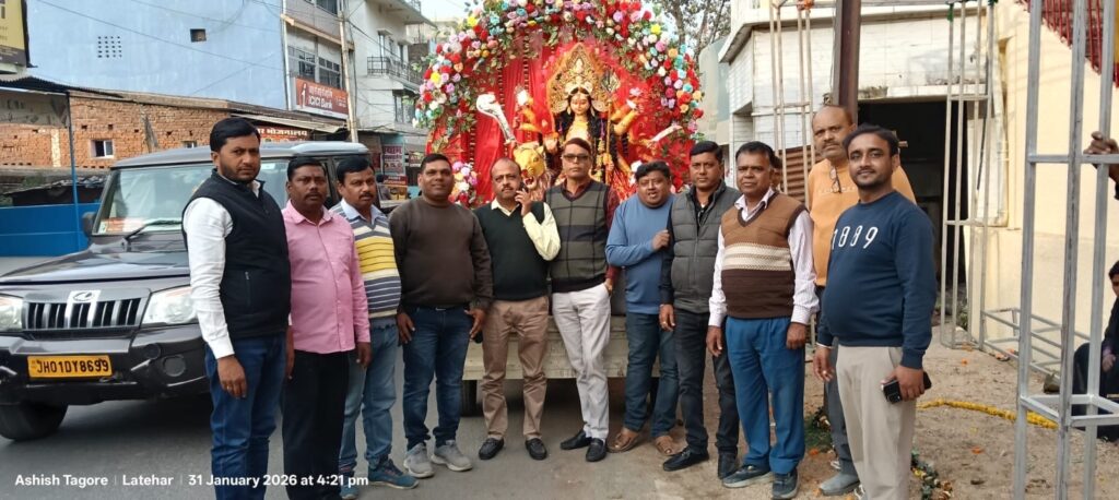 लातेहार:श्री वैष्‍णव दुर्गा मंदिर के 32 वें वार्षिकोत्‍सव का कार्यक्रम शनिवार को प्रतिमा विसर्जन के साथ संपन्‍न हो गया।मंदिर परिसर से अपराह्न तीन बजे विसर्जन जुलूस निकाली गयी।विसर्जन जुलूस मंदिर से निकल कर मुख्‍य पथ होते हुए भारतीय स्‍टेट बैक के सामने बड़ा तालाब पहुंची।यहां आरती के बाद माता की प्रतिमा का विसर्जन किया गया।इससे पहले चार दिवसीय कार्यक्रम के तीसरे दिन मंदिर परिसर में भगवती जागरण का आयोजन किया गया।जागरण का उदघाटन श्री वैष्‍णव दुर्गा मंदिर के मुख्‍य संरक्षक सह पूर्व मंत्री बैद्यनाथ राम के द्वारा माता का ज्‍योत प्रज्‍जवलित कर किया गया।जागरूण का प्रारंभ समिति के सचिव आशीष टैगोर ने भजन से किया।इसके बाद नव दुर्गा जागरण मंडली, रांची के कलाकारों ने एक से बढ़ कर एक भजन सुना कर लोगों को मंत्रमुग्‍ध कर दिया।राज निगम ने गणेश वंदना कर अपने गायन का प्रारंभ किया।उन्‍होने बांगड़ भोला व पप्‍पू पास हो गया समेंत कई भजन गा कर लोगों झूमने पर मजबूर कर दिया।वहीं शशि सरदार ने भी कई आकर्षक भजन गाये।