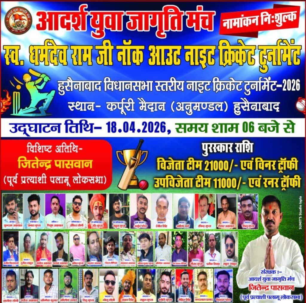 Palamu : खेल और उत्साह के संगम का गवाह बनने जा रहा है हुसैनाबाद का कर्पूरी मैदान, जहां 18 अप्रैल 2026 से स्वर्गीय धर्मदेव राम जी की स्मृति में विधानसभा स्तरीय नॉकआउट नाइट क्रिकेट टूर्नामेंट का भव्य आयोजन किया जाएगा। आदर्श युवा जागृति मंच के तत्वावधान में आयोजित इस टूर्नामेंट का उद्घाटन शाम 6 बजे हुसैनाबाद के अनुमंडल पदाधिकारी गौरांग महतो द्वारा किया जाएगा।